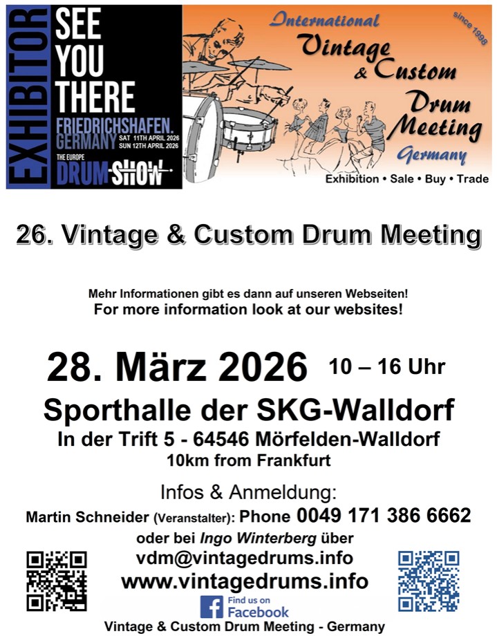 Das Vintage Drum Meeting entstand aus sporadischen Treffen einzelner Sammler. 1998 fand das erste offizielle VDM in Darmstadt, seit 2000 fand es jährlich in Neu-Isenburg statt, aber 2017 nun erstmals in einer neuen Location in Mörfelden-Walldorf! Termin ist der Musikmessen-Samstag. Anspruch war damals wie heute, ein Forum für Freunde und Sammler alter historischer Schlagzeuge zu schaffen. Ende der 90er Jahre war es noch nicht so einfach, sich Informationen über das Internet zu besorgen, auch gab es noch keine Fachliteratur (wie heute z.B. die Bücher von Rob Cook). Der Austausch von Informationen und die Ausstellung
